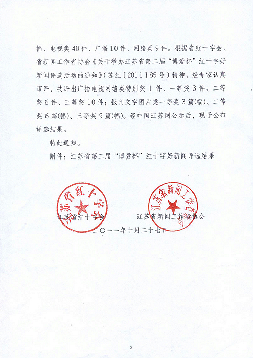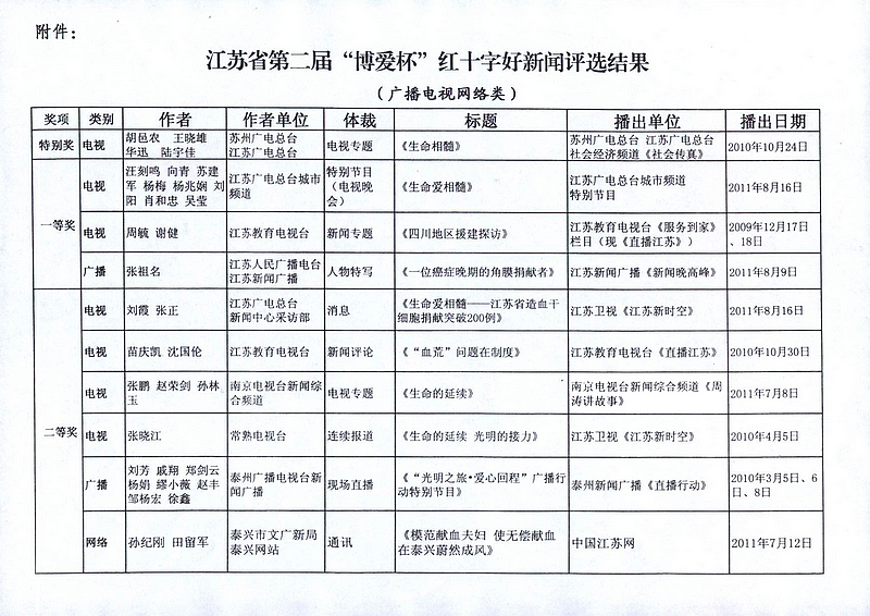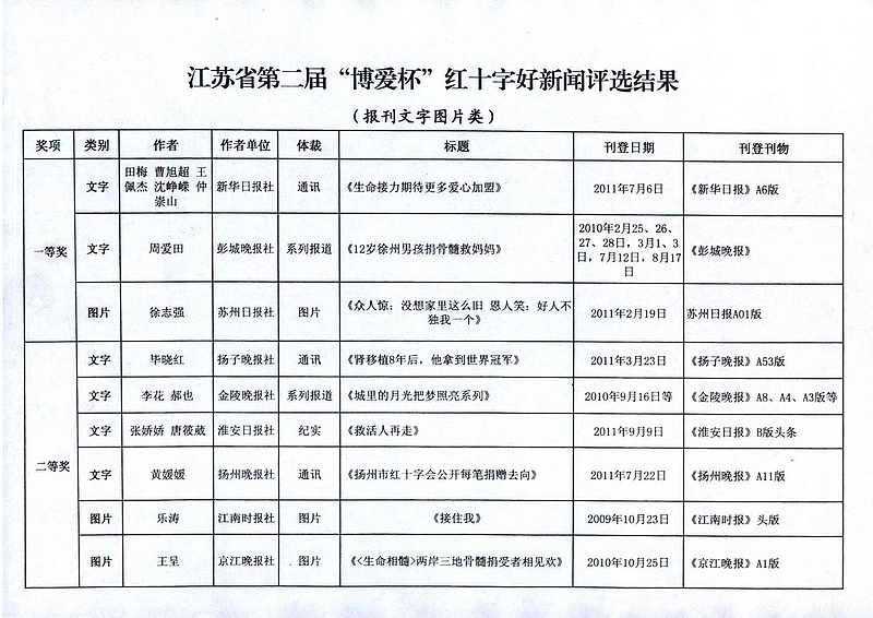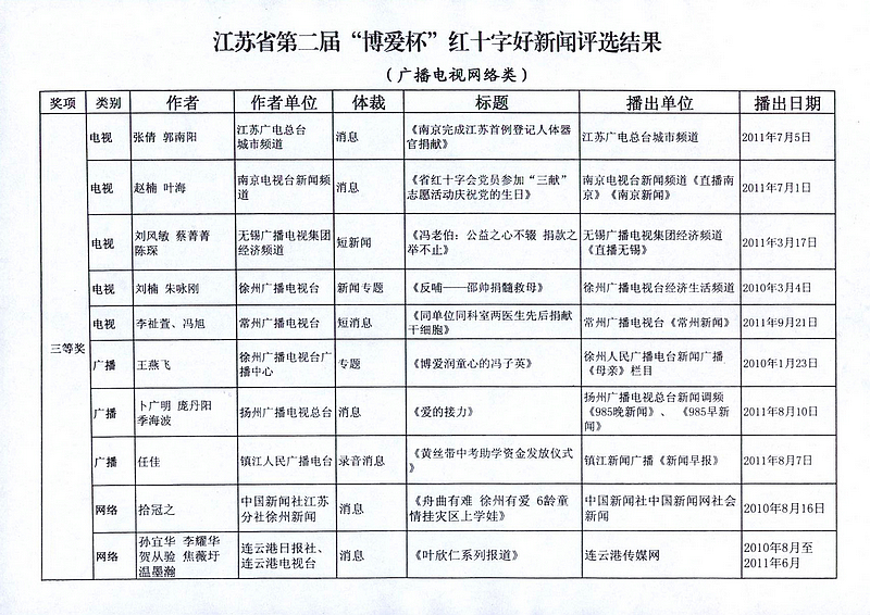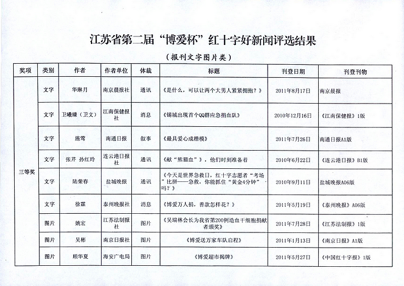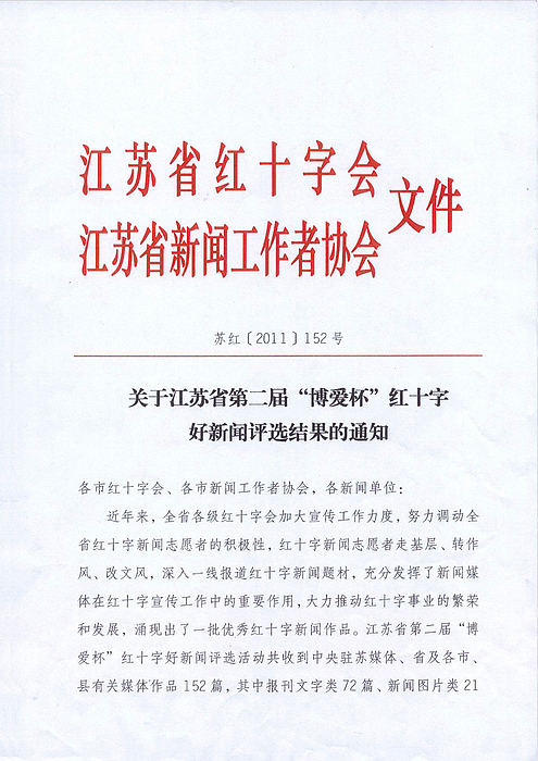 在11月11日上午召开的全省红十字宣传工作会议上,省委宣传部、省新闻工作者协会、省红十字会的领导为获得江苏省第二届“博爱杯”红十字好新闻的作者颁了奖。 今年6月27日,省记协、省红十字会共同发文联合举办江苏省第二届“博爱杯”红十字好新闻评选活动,共收到中央驻苏媒体、省及各市、县有关媒体作品152篇,其中报刊文字类72篇、新闻图片类21幅、电视类40件、广播类10件、网络类9件。这些候选作品:一是围绕宣传“人道、博爱、奉献”的红十字精神这一主题,充分报道了各级红十字会和社会爱心企业、爱心人士在人道救助领域所做的实实在在的、感人的事迹,生动反映了红十字会在致力于改善最易受损害群体境况中忠实履行红十字会宗旨和七项原则,为大力弘扬红十字精神,推进红十字事业健康、科学发展创造了良好的舆论环境。二是报道救灾救助的感人场景,反映接受捐助群众的肺腑之言;既有对爱心企业、爱心人士慷慨解囊的深度报道,也有反映无偿捐献骨髓、无偿献血、捐献人体器官(组织)救人生命的生动报道;既有积极参与普及卫生急救知识提高全民素质的志愿工作者的辛勤劳动,也有反映在烈日下、风雨中致力于红十字知识传播的红十字青少年的无私奉献。宣传报道的重点突出,反映亲情、友情、人间真情报道明显增多,体现出了人间大爱。三是宣传载体日益多样化,152件作品分别来自国家级、省、市、县级的电视、电台、网络、报刊等多种渠道,作品体裁上也是丰富多彩,有消息、通讯、评论、特写、新闻图片等。这些候选作品经专家认真审评,共评出广播电视网络类特别奖1件、一等奖3件、二等奖6件、三等奖10件;报刊文字图片类一等奖3篇(幅)、二等奖6篇(幅)、三等奖9篇(幅)。