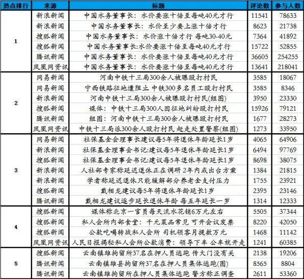 综合今日舆情数据,今日舆情热度最高的事件是“中国水务董事长称水价要涨十倍才行”,热度最高的单条网络新闻是腾讯新闻:“中国水务董事长:水价要涨十倍至每吨40元才行” 截至今日上午13时,“中国水务董事长称水价要涨十倍才行”相关话题位居今日舆情热点排行第一位,已有至少76万网友参与讨论和超过11.7万条网友评论。