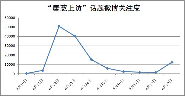 4月12日,社会各界强烈关注的湖南永州"上访妈妈"唐慧起诉永州市劳教委一案在永州市中级人民法院开庭。当天的各类媒体对此案进行了强烈关注,而引发“唐慧上访”相关话题舆情热度出现爆发性增长,当天的相关网络新闻报道由11日的100余篇暴增至800余篇,4月13日此数字继续维持在800篇之上。14日之后,舆情热度逐步回落。