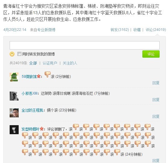 在雅安地震发生后的第一时间,中国红十字会就在其微博发布了赈灾信息,但微博网友对此并不买账,内容为“滚”的回复占据屏幕。对此,红十字会表示已经了解,并决定接受红十字会社会监督委员会的意见,“埋头苦干”。红十字会常务副会长赵白鸽表示,当前最重要的是救灾,微博暂“不去管它”。