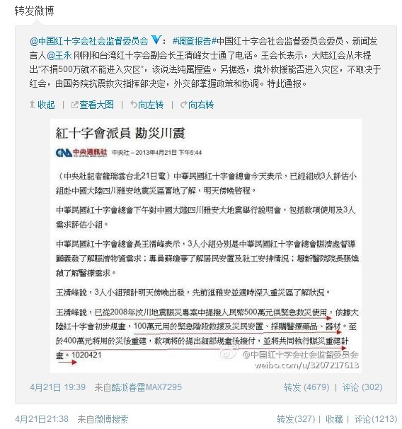 红十字会官方微博发布消息称“台湾红十字组织来电关注震情并表示愿意提供可能的救助。” 而随后有网友跟帖称“中国红十字会总会要求台湾红十字会先援助五百万人民币再进入灾区救助。”引发众多网友质疑声声。