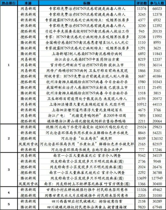 综合今日舆情数据,今日舆情热度最高的事件是“中国已研制出可治疗H7N9禽流感药物”,热度最高的单条网络新闻是新浪新闻:河北地下水受污染变红 近800只鸡饮后死亡。截至今日上午12时,“河北沧县环保局长被免职”相关话题位居今日舆情热点排行第二位,已有至少31万网友参与讨论和超过4.3万条网友评论。