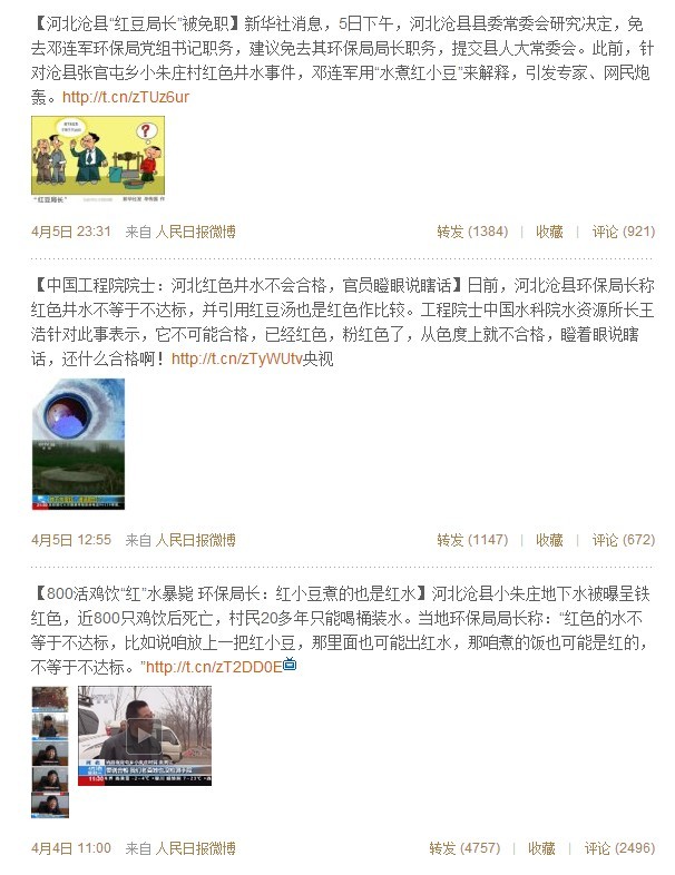 4月4日起,人民日报微博持续关注了河北沧县“红豆局长”事件。