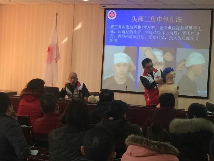 应急救护培训师在理论教学室通过多媒体形象生动的讲解了心肺复苏、AED操作使用以及现场急救的止血、包扎、固定技术等应急救护的专业知识,并对相关救护操作要领进行现场示范。