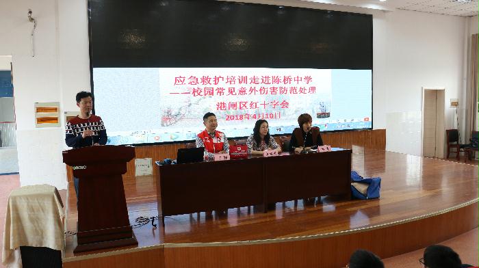 4月10日下午,南通市港闸区红十字会讲师团一行5人走进陈桥中学,对初一全体师生进行了“校园常见意外伤害防范处理”的应急救护培训,受到热烈欢迎和广泛好评。