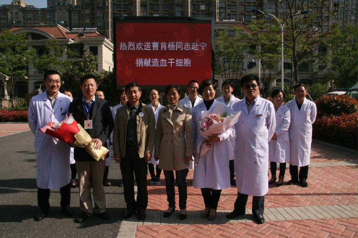 4月20日,南通市红十字会与市中心血站为曹育杨举行了简短而热烈的欢送仪式,市红十字会党组成员、副会长尤春,市中心血站站长严峰向曹育杨夫妇送上鲜花表达良好祝愿。在爱人陈燕华、同事顾红波以及红十字会工作人员单俊楠的陪同下,曹育杨踏上了前往南京捐献救人的旅程。