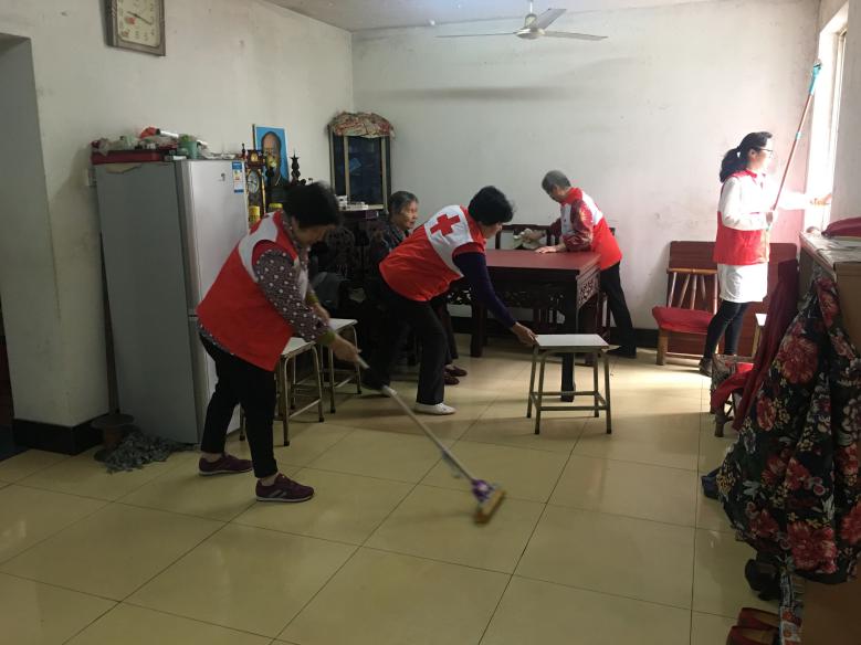 社区红十字志愿者们来到社区独居孤寡老人家中,陪他们拉家常、打扫卫生,询问老人身体健康状况,老人们脸上都洋溢着幸福的笑容。