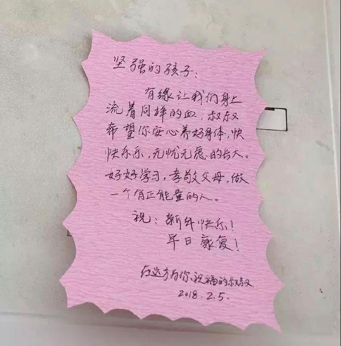 即便在准备捐献的前几天一直在打促进体内造血干细胞生长的“动员剂”,身体有酸胀感,细心的孙晓建还为那位陌生的8岁河北女孩准备了一份小礼物,贺卡上也写满了殷殷的祝福和期盼:“坚强的孩子,有缘让我们身上流着同样的血,叔叔希望你安心养好身体,快快乐乐、无忧无虑的长大,好好学习,孝敬父母,做一个有正能量的人。祝新年快乐!早日康复!——在远方为你祝福的叔叔 2018.2.5”。