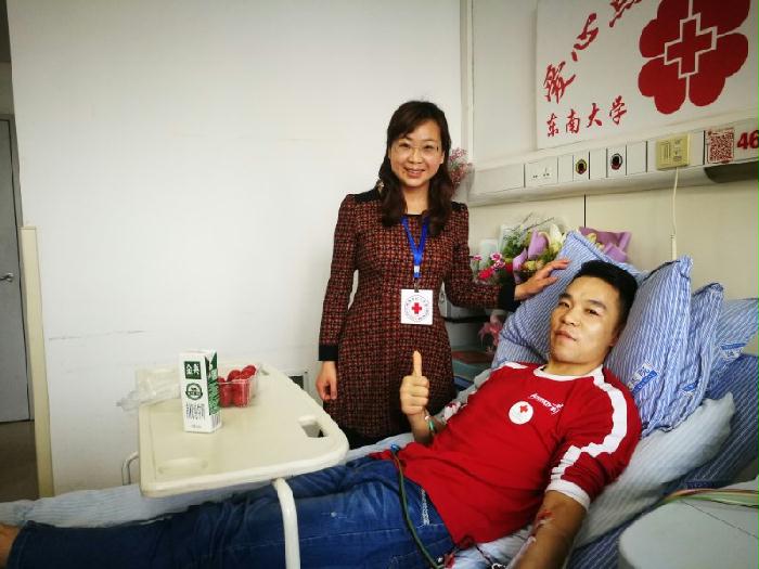 市造血干细胞捐献工作服务中心副主任陆洋在采集现场陪同孟献辉,给他加油鼓劲,她还带来了市红十字会领导的关心和慰问,让孟献辉格外温暖。南通安利公司的陈新主任带着公司领导与伙伴的关怀与敬佩,给孟献辉以团队的力量。成功捐献造血干细胞志愿者代表万永安给孟献辉送上鲜花,并带来了南通造血干细胞捐献爱心大家庭的祝福。