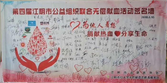为弘扬无私奉献、乐于助人的志愿者精神,传播社会正能量,在第15个“世界献血者日”到来之际,6月10日上午,由江阴市志愿者协会、市红十字无偿献血志愿者服务队发起的“我志愿,我快乐,我健康,我献血”第四届江阴志愿者团队联合无偿献血及造血干细胞采样活动在江阴市红十字血站举行,来自11个志愿者团体及爱心单位的近百名志愿者来到献血现场,卷起袖管,奉献热血。