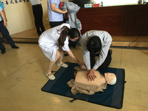 活动现场,来自昆山市精神卫生中心的红十字救护师资蒋旭胜医生首先介绍了红十字运动的起源及发展,使大家了解了红十字会历史渊源和志愿精神。随后,蒋医生为大家仔细讲解了现场评估、判断病情、现场挽救生命原则、现场救护的生命链等救护知识。理论与实际相结合的讲解方式、幽默风趣而又不失严谨的讲解风格吸引了全场学员的倾听。蒋老师重点向大家讲述了心肺复苏术和急救包的使用方法,并通过现场示范演练让大家切实地体验到了心肺复苏的操作程序和动作要求。韩丁老师为大家讲授示范了创伤止血术、现场包扎术、现场骨折固定、伤员搬运等创伤救护技术。