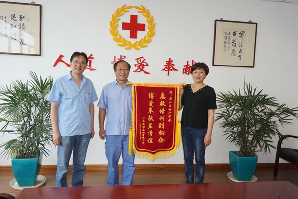 6月25日下午,两位身穿淡蓝色工装服的中年男子带着一面写有“急救培训到钢企,博爱奉献显情谊”的大红锦旗来到苏州市吴江区红十字会,专程前来道谢。