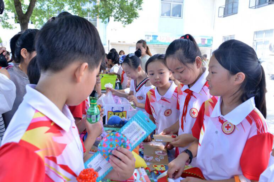 6月1日当天,由于室外天气炎热,活动在各班级走廊进行。文艺汇演结束后,各班级的“红十字青少年卖家”们就事先忙碌开来,将自制饮料、自制手工、书籍、手工艺品等“商品”按照规定的摊位摆放好,并明码标价。当学校宣布活动开始,作为“买家”的孩子们陆续进入卖场,挑选自己中意的物品。“这个多少钱啊?”“你好,这个5元,您想要可以便宜点儿。”“老师,您看这盆栽不错,放在办公室可以净化空气哦!”……整个上午,校园内人声鼎沸,大家的点点爱心汇聚成最美的六一旋律飘荡在校园上空。
