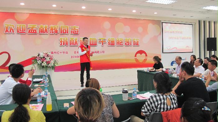 为挽救一位素不相识的18岁白血病男孩,5月3日,安利南通分公司经销商孟献辉在南京成功捐献了造血干细胞。6月4日下午,南通市红十字会在安利公司召开欢迎会,欢迎孟献辉同志捐献造血干细胞凯旋。市文明办副主任马佩军,市红十字会党组书记、常务副会长潘国华,市红十字会党组成员、副会长尤春,安利公司领导及孟献辉团队的小伙伴出席欢迎会。